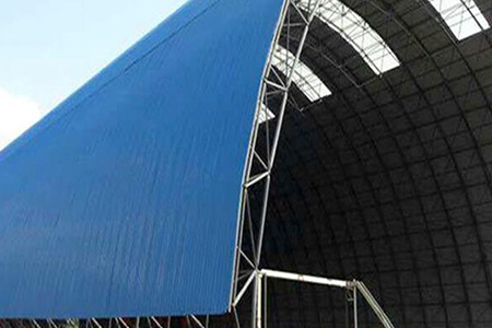 近年來,隨著計算機技術在結構計算和設計領域的迅猛展,干煤棚網架結構得到越來越多的應用。從 80 年代發展至今,干煤棚結構主要采用了平面鋼架、平面桁架、平面拱和網架結構,其中網架結構由于結構受力呈空間狀態、整體剛度大、單根桿件受力較少、用鋼量經濟等特點得以廣泛應用,滿堂腳手架高空散裝法、折疊展開式安裝法、分條分塊安法、整體提升法和累積滑移法等安裝方法也得到了廣泛應用。本干煤棚工程采用大型網架鋼結構,場地狹小,工期較短,選用安全、經濟、可靠的吊裝方案成為施工難點。